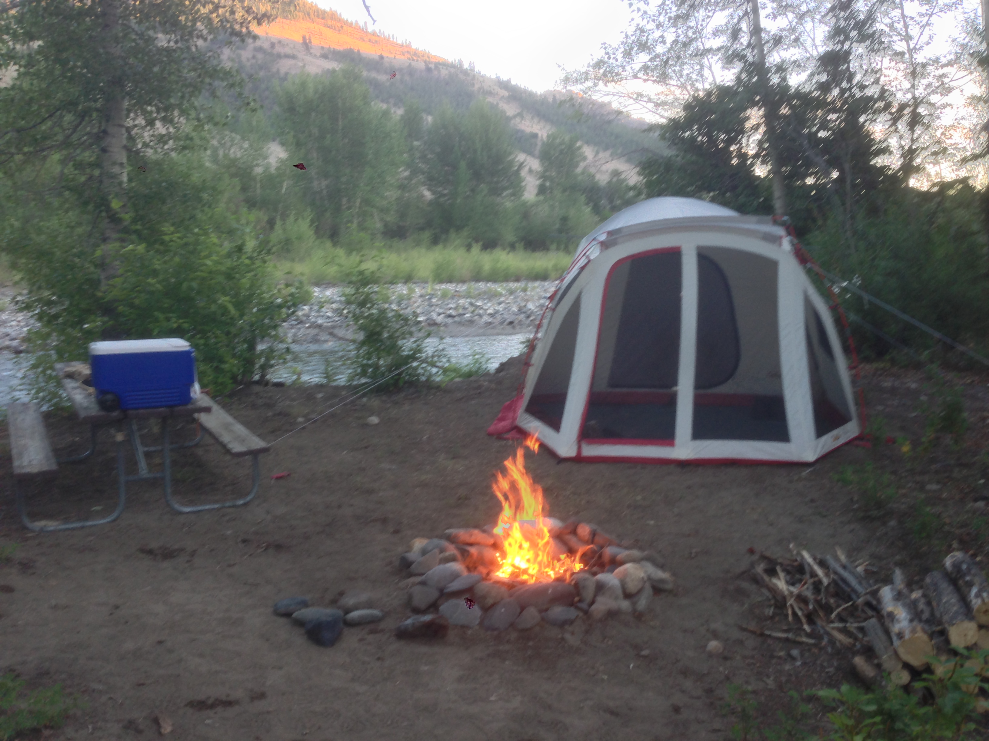 I survived the camping trip. Not only that, but it was a great trip all around. We stayed at Garden Creek Campground on the East Fork of the Big Lost River, and it was pretty amazing. Basically just followed Trail Creek road, up over the pass and about 4 miles past the turnoff for Copper Basin (Wildhorse Road). Ended up being 29.9 miles from the stoplight in on Main and Sun Valley Road in Ketchum.