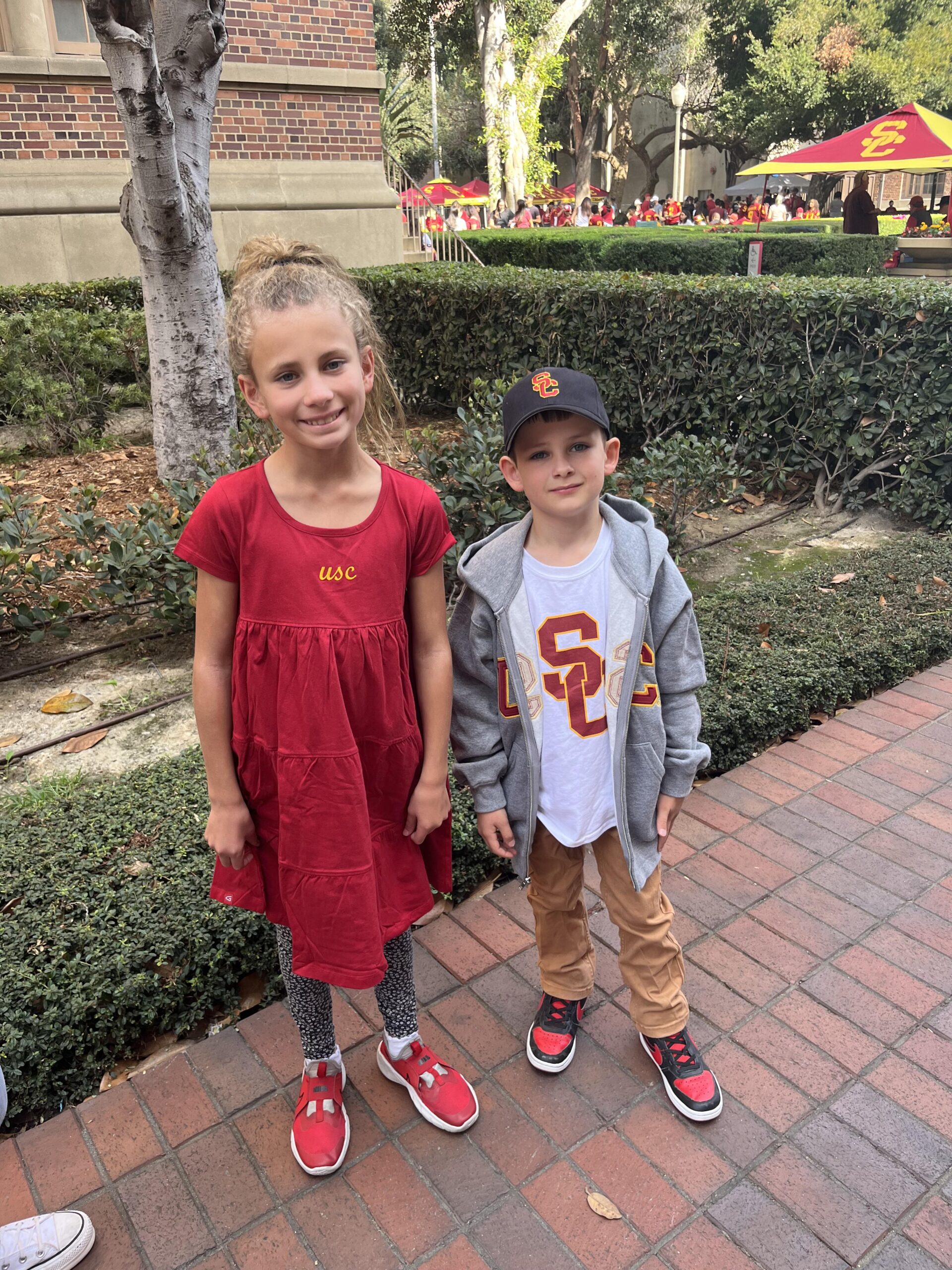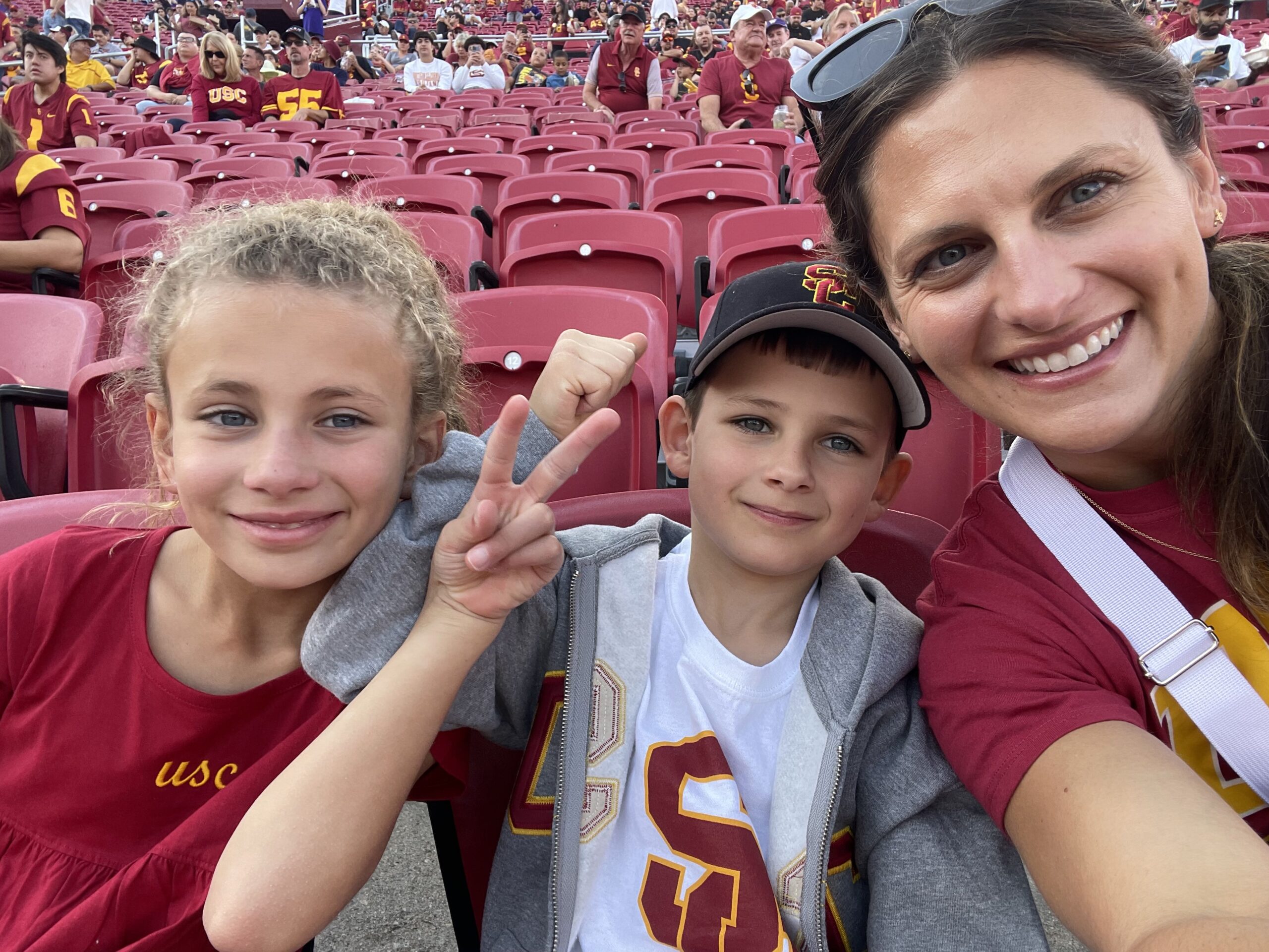 Saturday we woke up and relaxed for a bit before heading to campus. We then walked around and mom showed you USC as the tailgating continued. We went to the bookstore and spent way too much money decking you out with all the gear that you see in the pictures (dad got nothing and mom wasn't happy). After watching the marching band then come through campus, we walked over towards the stadium. We first stopped off at the National History Museum of Los Angeles because they had the shuttle Endeavor. After leaving the museum we went to the sold out game. USC was playing Washington, who at the time was I believe #2 in the country. There were 90k+ people in the stadium - more people in one place than either of you had ever seen. You handled it well (was expecting you to be overwhelmed) and we stayed for nearly the entire game. In the end Washington ended up winning by a touchdown (don't feel bad, they played for the national championship later in the year). We then headed back to the hotel.
