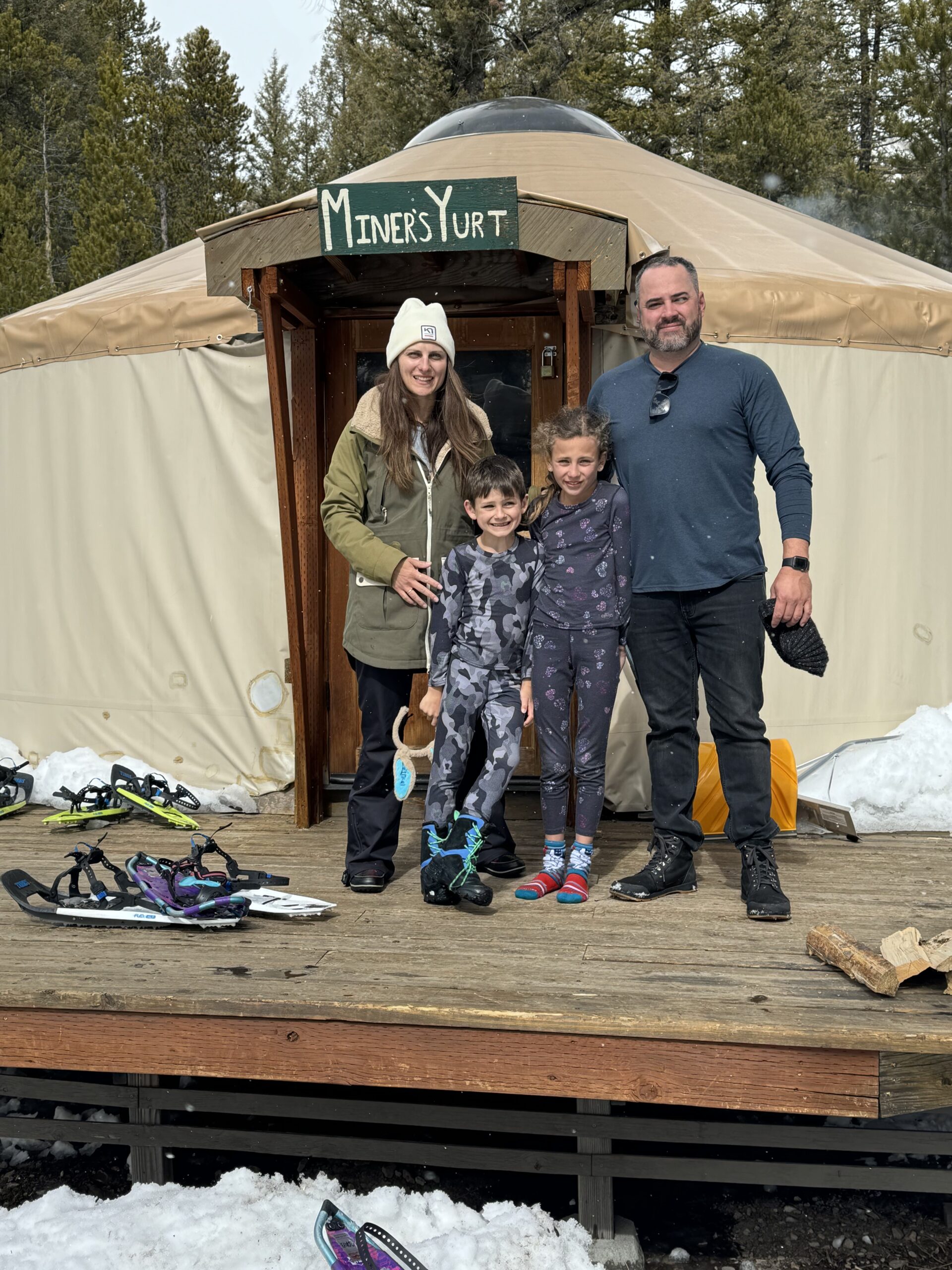 Probably the coolest trip was when we stayed in the yurt. Up at Galena you can rent a yurt for the night - no electricity and you stay on bunk beds. The yurt itself it pretty basic. It has a table in the middle, a kitchen with a couple burners and a sink (but no running water), an outhouse outside and a really cool wood burning furnace. The other part is that you have to snowshoe to the yurt. Mia had the idea and organized it. There were a number of yurts to choose from so she asked us, and I just mentioned one specific one not to choose because it was a 1.5 mile hike in and that's a lot for you guys. Well, you know Mia, and that sometimes she gets things a little wrong, and so instead of avoiding that one she chose it. You guys hiked 1.5 miles in snowshoes (which you had never worn) to the yurt. You were a trooper and hiked the whole time without complaining (can't say the same for your brother). Now it is still Sun Valley and fancy, so we didn't have to carry all our stuff, but rather the lodge snowmobiled it in for us (as well as a prepared dinner that we just needed to heat up) and it was waiting for us when we arrived. We all just hung out, played games, played in the snow and had a very cool experience. Was one of my favorite trips I have been on. The next morning we hiked out. You and I took the lead and made it back to the lodge well before everyone else (mainly because your brother was whining the whole time).