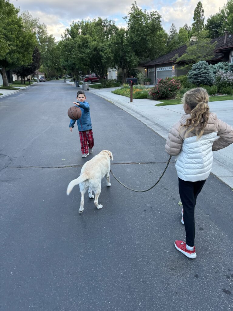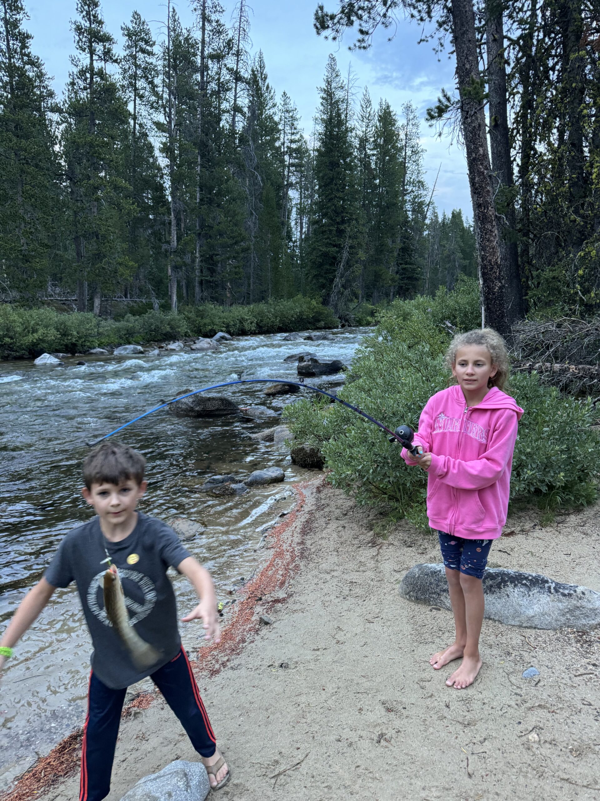 Most of the time we head just north of Ketchum. We bring your bikes, games, go on hikes, and go fishing (you caught a great fish as you can see in the pictures below). Lately your favorite thing to do is take Layla for walks. She is a monster at the camp site until she calms down, and you love being the one to calm her down and wear her out a little.