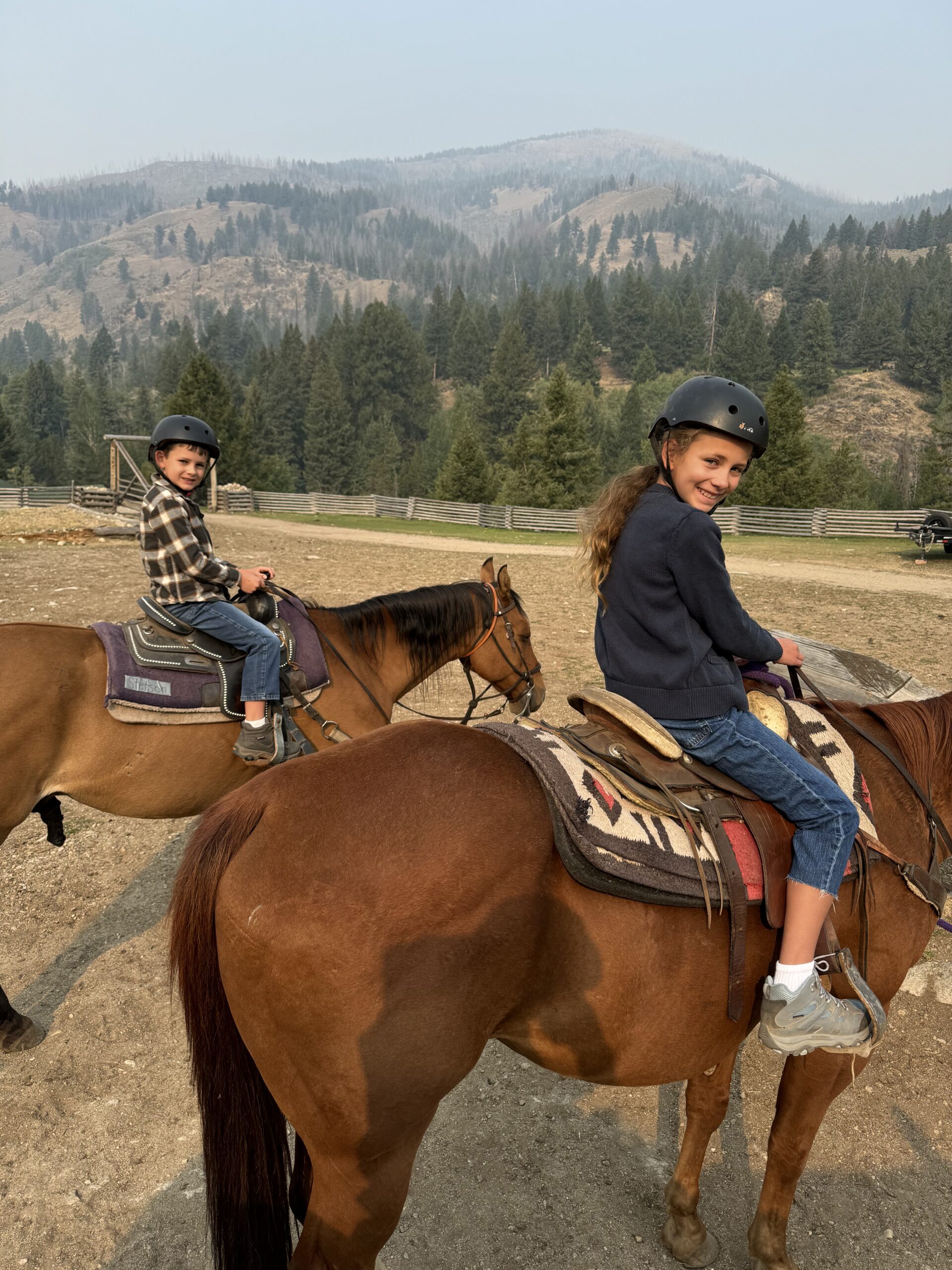 We also went to a place called Diamond D Ranch with Papa and Damian. It was a very cool ranch in the middle of nowhere. It was along the river and hidden back in the mountains. Only about 15 people can stay there at a time. As you can see below, the highlight for you was when you got to ride horses. We went on a trail ride into the hills. You and Ethan rode solo, and did a fantastic job. Unfortunately there was a wildfire nearby and the smoke got really bad. Your mom had a panic attach at 3am and then we had to leave the next morning.
